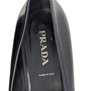 Authentic Prada kitten-heel loafers crafted in glossy black patent leather with signature silver buckle detailing. Sleek, structured, and timeless — the perfect blend of elegance and everyday luxury.