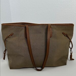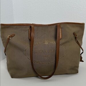 Chic Prada handbag with a rich brown exterior. Tan interior with subtle pattern. Perfect for everyday use.
