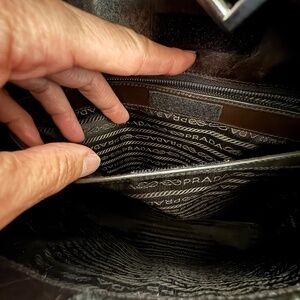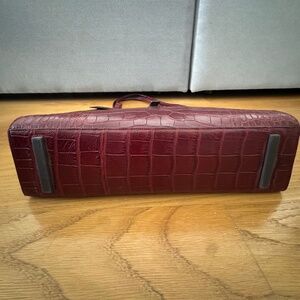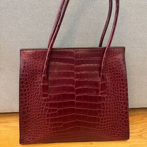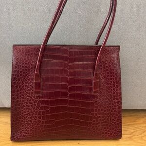 Authentic Prada, crocodile, burgundy shoulder bag in pristine condition. Measures from the base 14” wide x 12.5” tall, depth at the base is 4" (Becomes 12.5” wide at the top of the bag, like. a pyramid) See original price tag & certification cards. 3 divided sections inside.