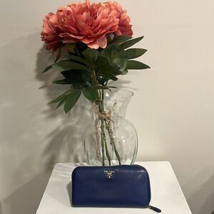 Beautiful Blue Prada Leather Wallet! Authentic, gently used and in excellent condition. All hardware is in great shape and works well and is in gold tone. This is a lovely used wallet. Please expect some rubbing, scratches and marks due to prior use. Please feel free to ask questions. Thanks so much