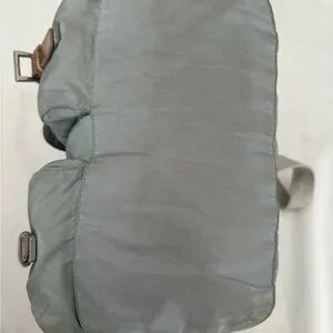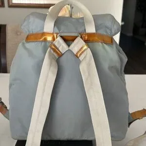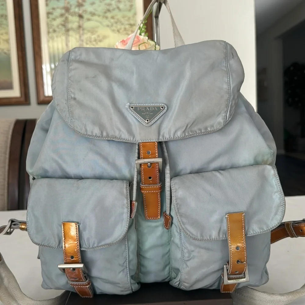 Authentic Prada backpack. It has discolorations and stains inside and outside. But it has no rips and still has a lot of life left. Light blue color and perfect medium sized backpack! Please review all pictures closely and manage your expectations as this bag is used and priced based on its condition.