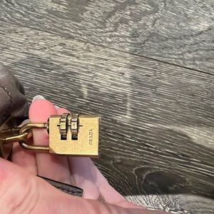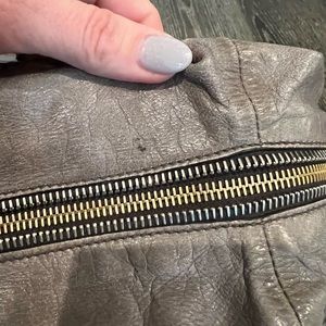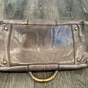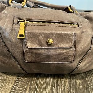 Gray/taupe in color, distressed leather, gold hardware, multiple pockets, lock
