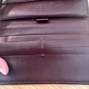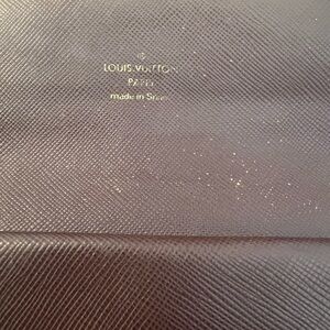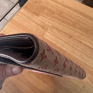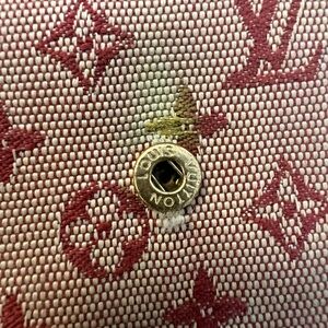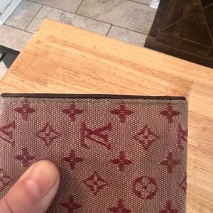 Louis Vuitton Mini-Lin long wallet- some overall fading and discoloration on the overall exterior, some corner wear, small scuffing on the interior leather throughout and wear underneath the button closures. This is a double snap closure and you could add a chain to crossbody or shoulder carry. Snaps work well. See pictures carefully for callouts. With a little TLC this could be a really nice piece for Mini-Lin collectors.