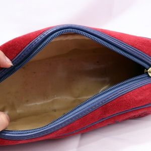Authentic Red Pencil Case Cosmetic Bag, Velour texture, blue decorations. The inside is covered with a plastic layer to protect or for easy cleaning.
