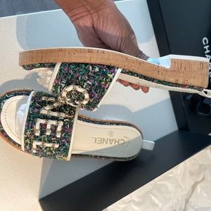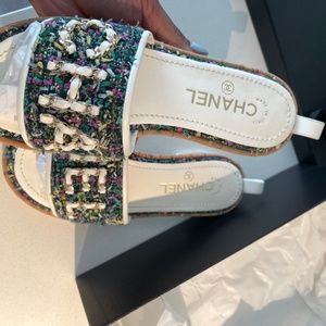 Green woven and chained Chanel Slides. Worn once to take photos. QR code for authenticity still attached. Dust bags included.