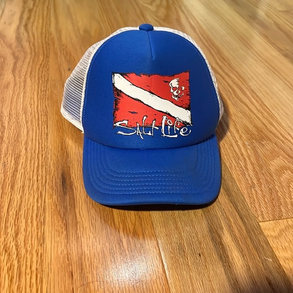 This is a real Salt Life hat that has the snap back to adjust the size to your head. It has the normal style of the “trucker hats” that you see often.