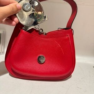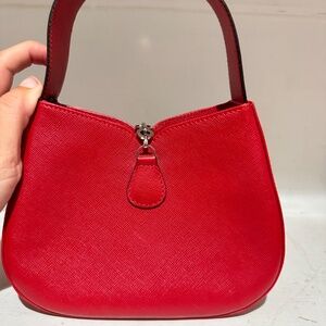 Guaranteed Authentic Salvatore Ferragamo Top Handle Bag or 100% of your money back. This bag is in red saffiano leather and features a magnetic snap mirror closure and one exterior pocket. The interior is lined with black Salvatore Ferragamo monogram canvas.