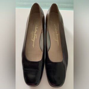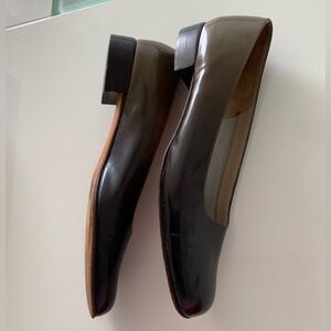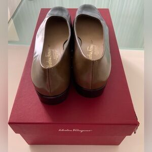 Chic olive grey gradient leather flats by Salvatore Ferragamo. Sleek design for versatile wear. Very cute classic shoes for work or for a more vintage look, olive green color gradient, goes from a light olive green to a darker one. Good condition, no scuffs on leather. Size 7 and 1 inch heel, serial number pictured.