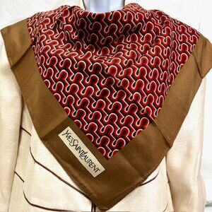 Authentic Scarf YVES SAINT LAURENT 100% Silk 30" Brown Burgendy Black Design(28