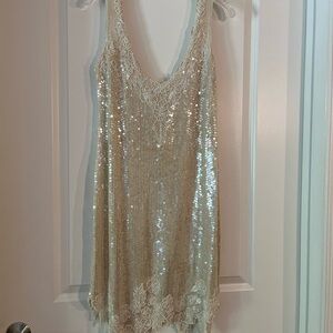 Cool and soft 100% Silk completely covered in MOP colored Sequins, and beautiful pearl-beaded accents along the sleeves, bottom trim and collar. It sparkles just like the tail of a Mermaid. The dress is from the 1920s and a size Medium (but it most likely would suit a size Small better). It is in good condition for its age (ca. 100 years, antique!), with some Sequins missing, but they could be replaced if you have a good Taylor at hand!