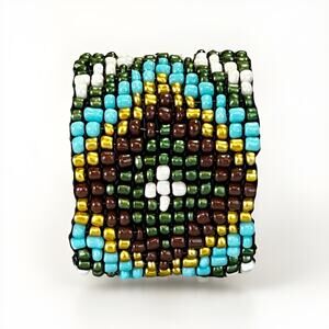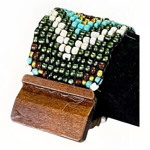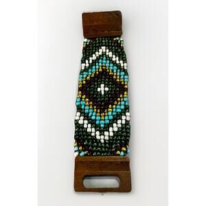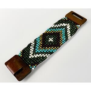 Handcrafted using vibrant seed beads in an intricate geometric pattern featuring shades of turquoise, gold, white, and earthy tones, this bracelet captures the essence of Southwestern artistry. Finished with natural wooden slide clasps for comfortable wear.