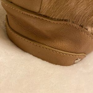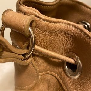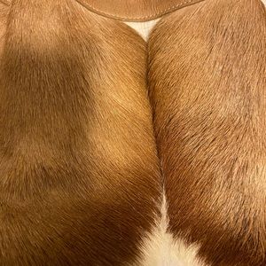 Authentic RARE Spring Bok drawstring purse imported from Cape Town, Africa by me. Purse individually made to my custom specifications. Camel (tan) colored leather with gold hardware, including feet on bottom and grommets for knotted leather drawstring. Leather on back, Spring Bok on front. Fabric lining inside. 1 zippered pocket over authentication placard and 1 unzipped pocket on opposite side. No flaws, stains, holes, tears. I never carried it. Can be carried year round. Spring Bok is Beautiful with NO cruelty involved.Please ask any questions you have. Height-11”, Length- 14”, Depth-5”. Handle Drop- 10.5”. Can be carried or worn on shoulder.