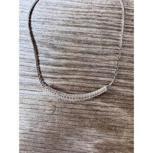 Elegant Swarovski necklace featuring a gently curved bar design encrusted with brilliant clear pavé crystals. The piece has a rhodium-plated finish that resists tarnish and adds a bright silvery shine. The necklace fastens with a sturdy fold-over clasp engraved SWAROVSKI, and the reverse side bears the Swarovski swan logo and © hallmark confirming authenticity.