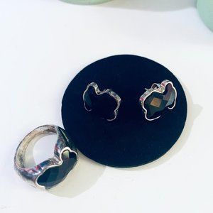 Authentic TOUS Color Silver Faceted Onyx Bear Earrings Ring (7) Set