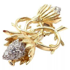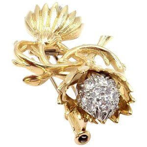 This exquisite Tiffany & Co Schlumberger double thistle pin is meticulously crafted in 18k yellow gold and platinum.