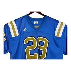 The product is an authentic UCLA Bruins men's 2XL Adidas football jersey in powder blue, featuring the number 28. This officially licensed jersey is designed for regular season games and is specifically for male fans of the UCLA Bruins team. Made by Adidas, the jersey showcases the team's colors and logo, making it a perfect choice for showing support during games or as a stylish casual wear item.