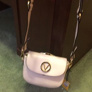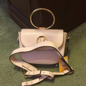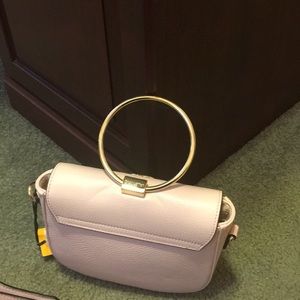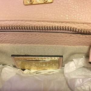 Pale pink leather with gold hardware and leather strap. This purse can be used as a crossbody or wrist purse. It has an inside pocket and offers versatile use. Brand new with tags. Orig price $895