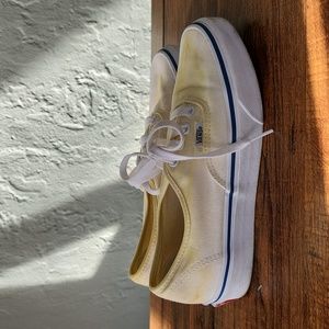 EUC Used a handful of times. Originally a cream color (last pic). Tried to wash but ended up getting weird yellow stains. Also has a blue stain from dye. Can be tie-dyed or painted for custom sneakers. Comes with original box.