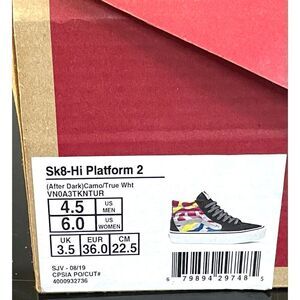 Authentic Vans Sk8-Hi Platform2 After Dark Camo Sneaker Unisex Size Men’s 4.5/ 6WMNS. Combines the legendary vans high top with printed canvas and sturdy suede uppers. Padded collars for support and flexibility. Worn Twice w/OBX