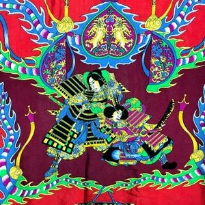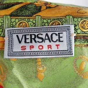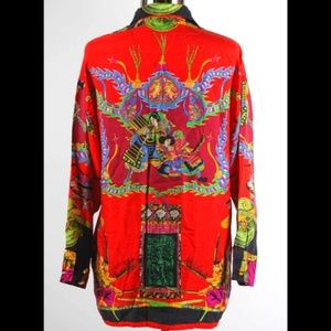 Authentic Vintage Luxury Versace Sport 100% Silk long sleeve Men's Shirt, size 42 in excellent pre owned condition. See photos. Stunning eye catching long sleeve top with vibrant reds, greens, blues & gold logo button down black cuffs and collar. Loose fitting even hem style. Would look great on a woman too!. Chinese Warrior Scene with various stunning images. Approx: 22" across shoulders, 30.5" length, 20.5" sleeve. Versace's design. Definitely a collectors piece. From no pet/smoke home.