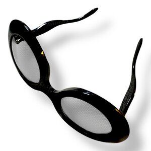 Sleek black sunglasses featuring a bold flared round design, offering a statement look. Includes a stylish branded case and box for protection.