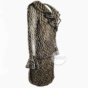 Gorgeous vintage Bill Blass semi-formal cocktail set featuring a stunning illusion lace jacket and matching skirt. This 2-piece ensemble is crafted with gold metallic thread and lined in luxurious silk (sleeves are unlined for a sheer effect).