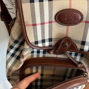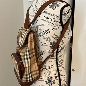 Haymarket print. All leather. Front zippered pocket. String and snap closure. Also Side zipper for extra access. All zippers are zippy. Adjustable straps. Does not show any wear or scratches. In very good vintage condition.