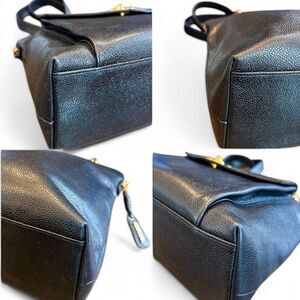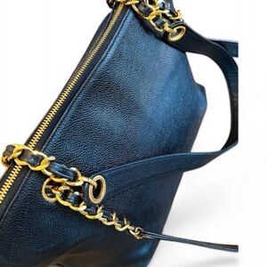 Make heads turn with this tote bag from Chanel. Crafted using black caviar leather, it features 24K gold plated CC logo on the front, turn lock closure pocket on the front, top zip closure, chain & leather dual straps, and a spacious interior with side zip pockets. This bag can accommodate all your essentials, carrying you shopping and even to work. The spacious interior allows you to fit all your daily essentials, and can fit a 13 inch laptop.