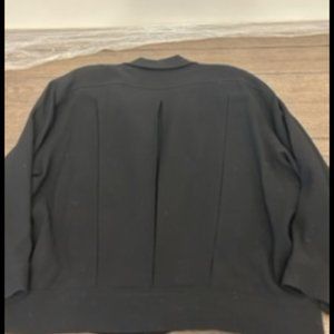 Jacket has 3 wide pleats in back and has a wide banded bottom that buttons
