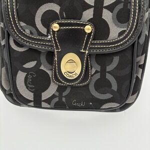 The Authentic Vintage Coach Signature C Crossbody bag is a stylish and versatile accessory for women. Made from durable canvas material with black and silver exterior color with brass hardware, this small rectangular bag features a zip closure and adjustable crossbody strap for added convenience. The classic coach design and vintage appeal make it a timeless piece for any outfit, perfect for everyday use or special occasions.
