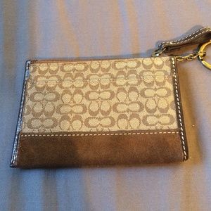Small authentic vintage keychain Coach coin purse circa 2005 in excellent condition. Minimal wear on brown suede on bottom from being inside a purse. It has a zip pouch and one slot on the back. Keychain is not removable, has antique finish on metal. Great for carrying change, a few cards, and cash. All items priced to sell.