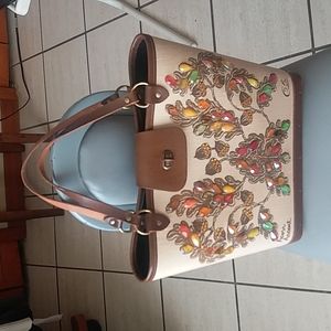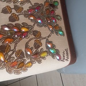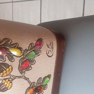 Rare Design Very Beautiful Authentic Vintage Enid Collins purse. A good luck charm Acorn Accents quiet hard to find. Excellent vintage condition clean inside out. Bought recently haven't been worn by me yet. Large size 13x11x4. All jewels intact and sparkling like Christmas tree. One zipper pocket inside with Enid Collins stamp. Leather trims with burlap fabric. Very minor wear on the strap. Wooden bottom. Fits tons of stuff in it. Great collector's item that will never go out of style. Thanks.