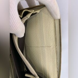 Cloth interior change pocket show some fraying. Over all interior leather shows edge rubbing, overall in good condition. Zipper work well.