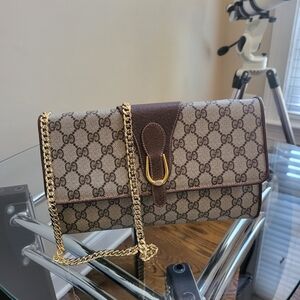 Elevate your style with this Gucci tote bag. Featuring a classic brown and tan design, this bag is perfect for any occasion. The iconic Gucci pattern adds a touch of luxury to your ensemble. Beautiful vintage Tote Sherry Web Ophidia line, 2 tone colors metal logo, canvas in great clean condition, leather handles and trim are good,,little wear on top center of handles but no cracks or rips, I side few little stains (see picture) can be clean, bottom corners little scuffing not noticeable, inside pocket zipper works great and very clean,, overall 8 out of 10 bag..