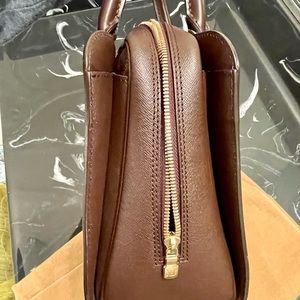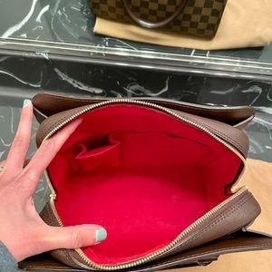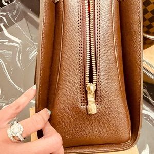 This compact handbag is crafted of signature Damier coated canvas in brown, complemented with dark brown rolled leather top handles and matching cross-grain leather sides. The bag features a full patch pocket on either side and gold wrap-around zippers that open to a red microfiber interior with two pockets in the middle. This is a versatile bag for everyday affairs, with the classic appeal of Louis Vuitton!