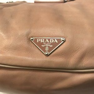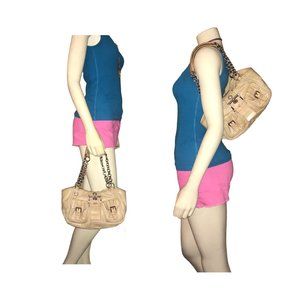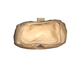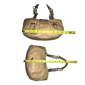 The bag is in "Light Peach" color, shown in the accompanying video. It has thick, durable leather that remains strong over time, with a professionally repaired interior lining. The shoulder strap is non-adjustable and non-removable, and it has a magnetic closure. Leather conditioner will be applied until sold for preservation.