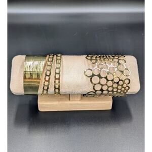 This set includes one authentic vintage Paco Rabanne gold bubble cuff — complete with the designer’s PR logo cut-out — paired with a sleek, modern gold-tone cuff for easy stacking or contrast.