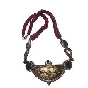 Authentic Vintage Red Coral Beads Necklace Gold Tone Pendant Statament Jewelry