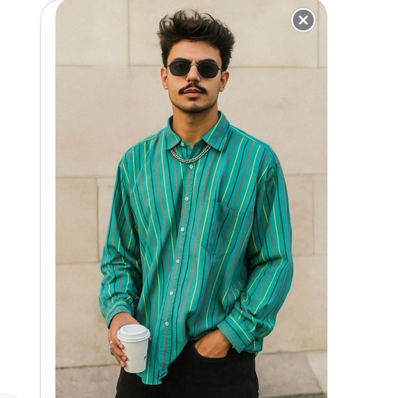 Add a pop of color to your wardrobe with this vintage striped men's shirt. Featuring vibrant green and multicolor stripes, this shirt is perfect for any occasion.