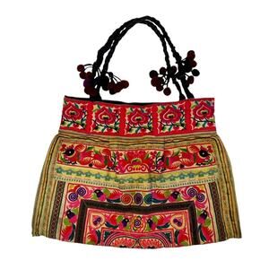 Gorgeous authentic Y2K-era bag purchased in Spain, featuring intricate Mexican embroidery with vibrant floral and bird motifs, accented with metallic detailing. Braided straps with playful pom-poms add a boho-chic touch. Excellent condition and perfect for adding a pop of color to any outfit.