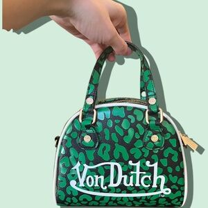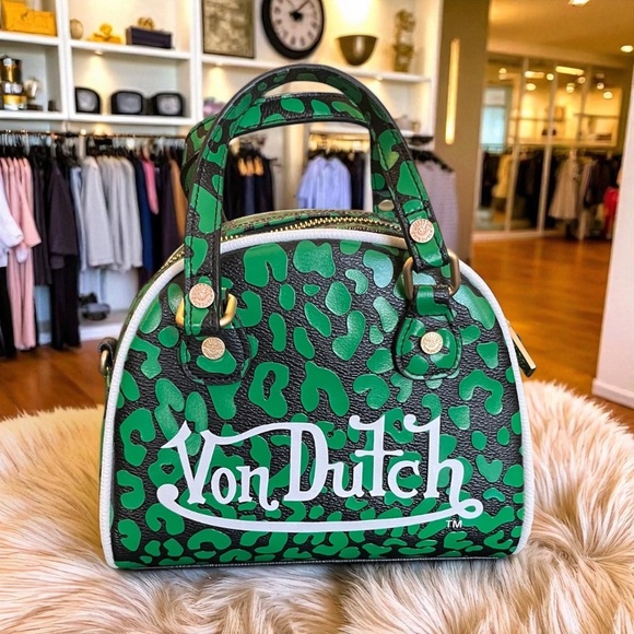 Authentic Von Dutch lime cheetah bowling bag in vibrant green and black vegan leather with white piping and gold hardware. Features top handles, detachable crossbody strap, and signature logo interior. Excellent preowned condition with minimal wear. A rare Y2K statement piece that’s bold, funky, and totally on trend.