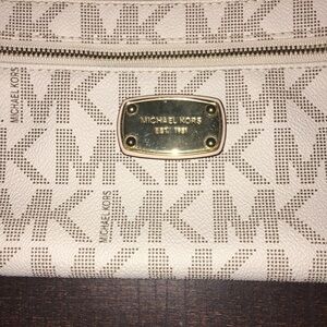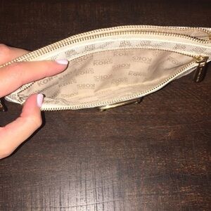 White & beige Authentic Michael Kors wristlet with gold accents. In great condition!! A few small scratches on front plate, 2 zipper pockets, with credit card holders, and another large pocket. Super cute!!