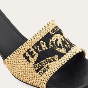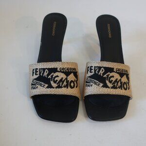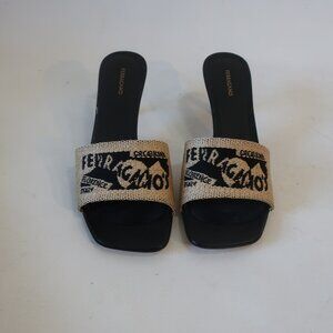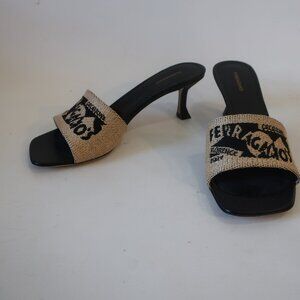 Authentic Womens Ferragamo Honey Black Jacquard Logo Open Mule Slide Heels 7.5