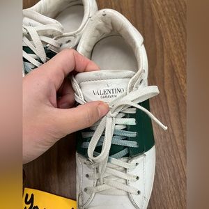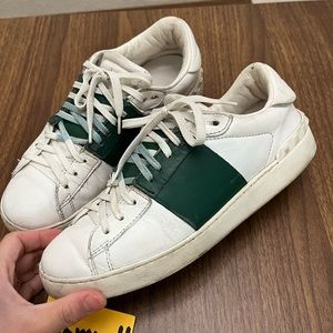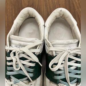 Valentino Garavani Open Sneaker in white/green calfskin leather. overall is still in good used condition. No rips or any damage. has signs of wear throughout the shoes. Size 38.5