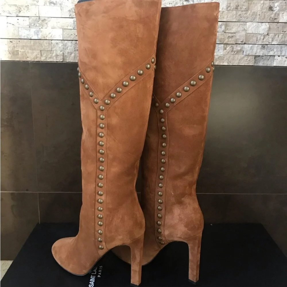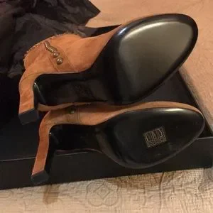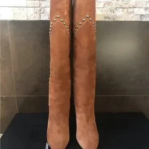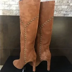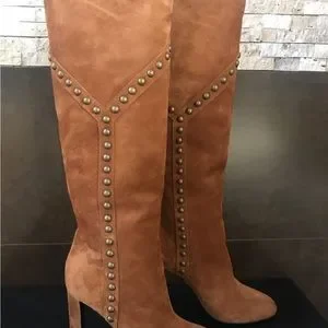Authentic and brand new. Gorgeous suede boots. Pull on boots. 4” heel, aged gold nailhead studs