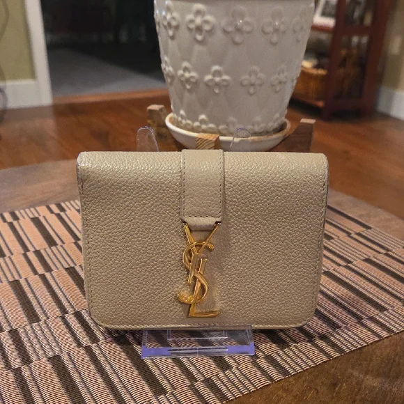 Chic Yves Saint Laurent wallet in taupe/beige leather. Features iconic gold logo. In good condition with rubs on the edges, as pictured. Otherwise, the exterior and interior of the wallet are good. Please zoom in on the pictures and ask any questions before purchasing since the wallet is sold AS IS.