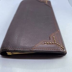 NOTE - this is an older wallet with signs of general age and wear. There is some stickiness and light peeling inside the pockets and plating wear on the gold tone hardware. Some wear around the edges / trim.