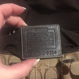 Brown authentic coach bag with 2 front pockets , a zip pocket and another behind the zipper .