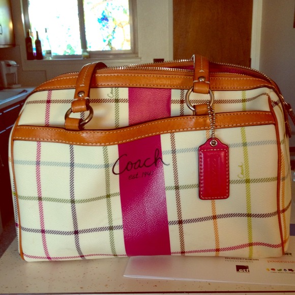 This is a vinyl Tan, off white and pink purse. This purse was only used a few times and is in excellent condition. No stains or rips. This comes from a pet free/smoke free home. I'm only excepting PP for this purse