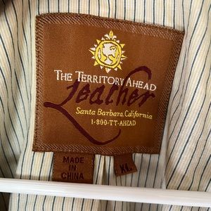 Size Xl but fits like a large. Brand is The Territory Ahead, Real genuine leather jacket. Perfect for a 70’s aesthetic look. Tanish brown color. Only worn a couple times and in very good condition. Am willing to negotiate on price.